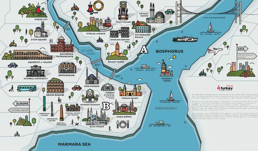 The letter "B" on this map is where our hotel is located, also referred to as the Historical Peninsula. Notice the "old city/historical peninsula" is physically separated from the cruise dock by a waterway called the "Golden Horn". In this area there are many attactions very close, so convenient. Hope we have enough time!!!